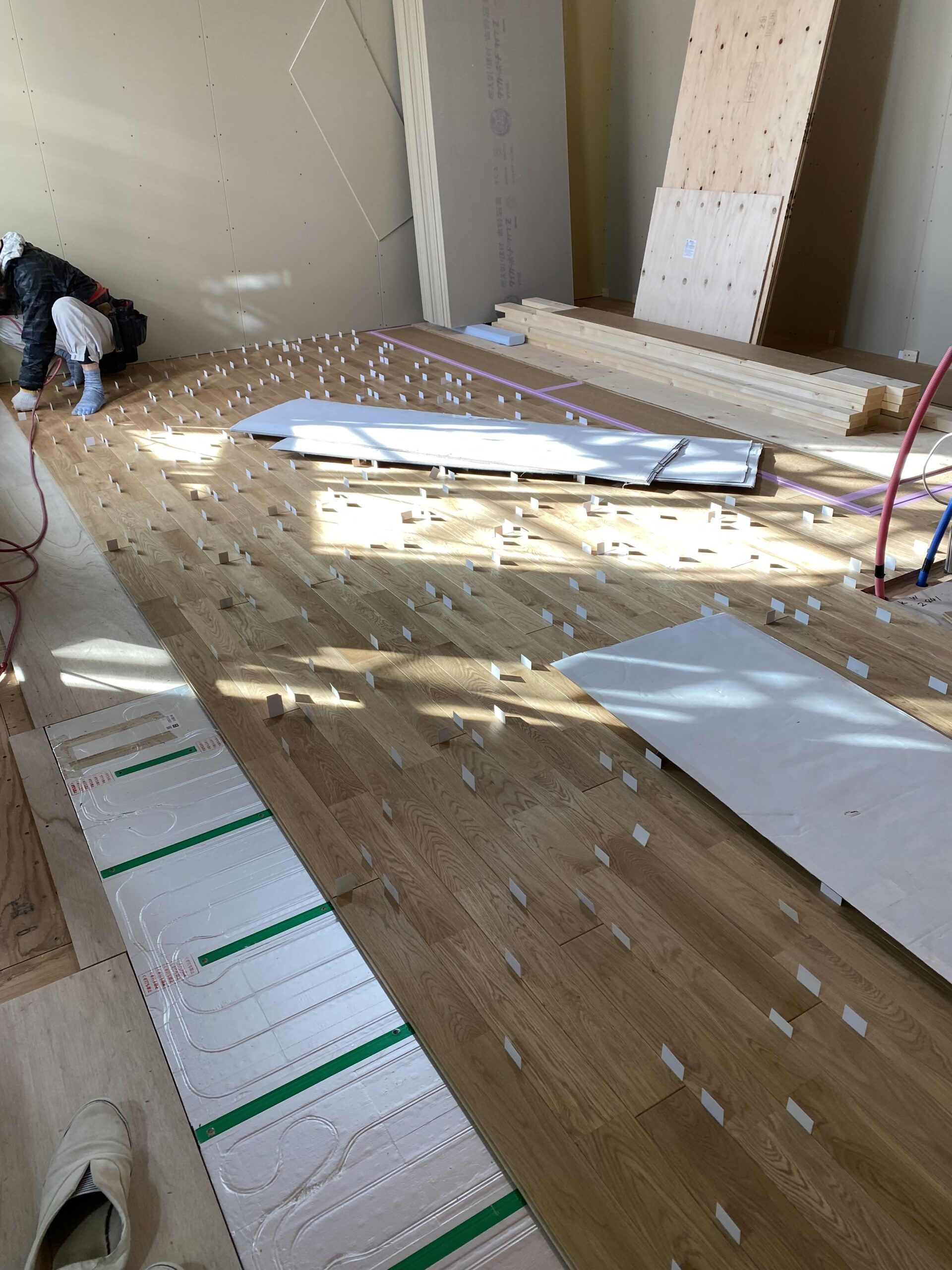床材と床材の間に紙を挟みながら施工します!