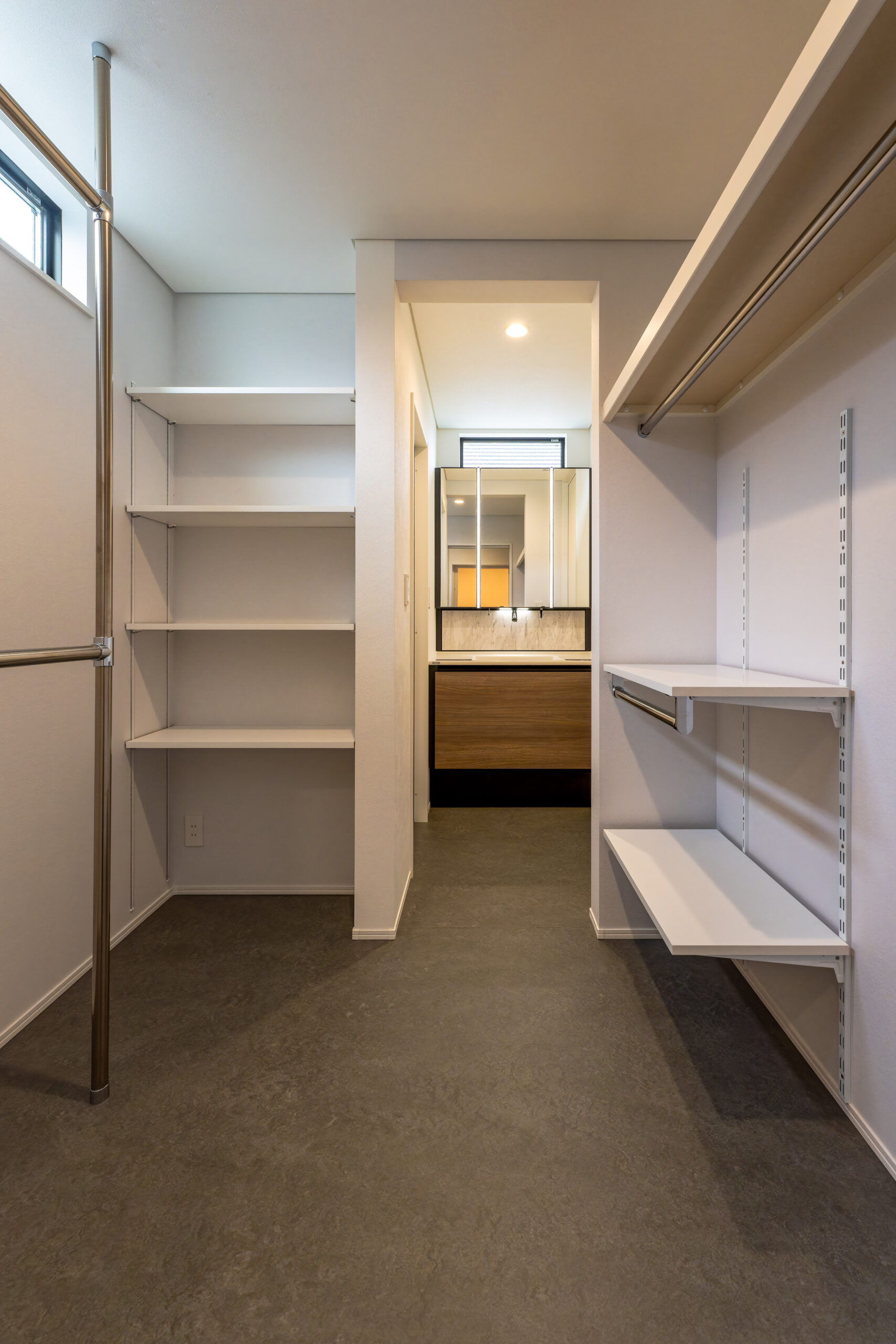 リビングから繋がるFCL(ファミリークローゼット)、奥にはランドリールーム兼浴室。
