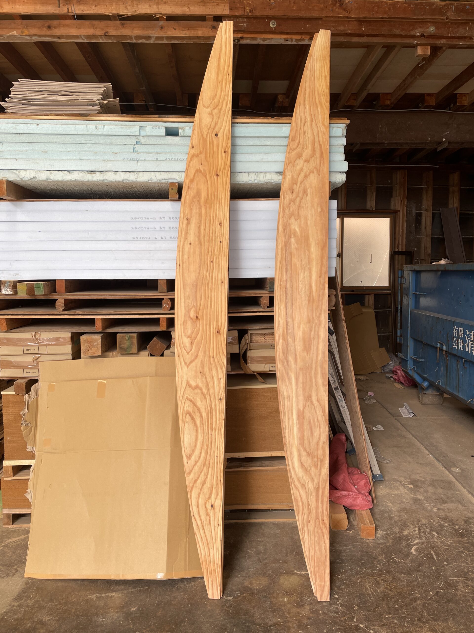 弊社作業場で大工さんが一生懸命造っていた綺麗なカーブがかった板。