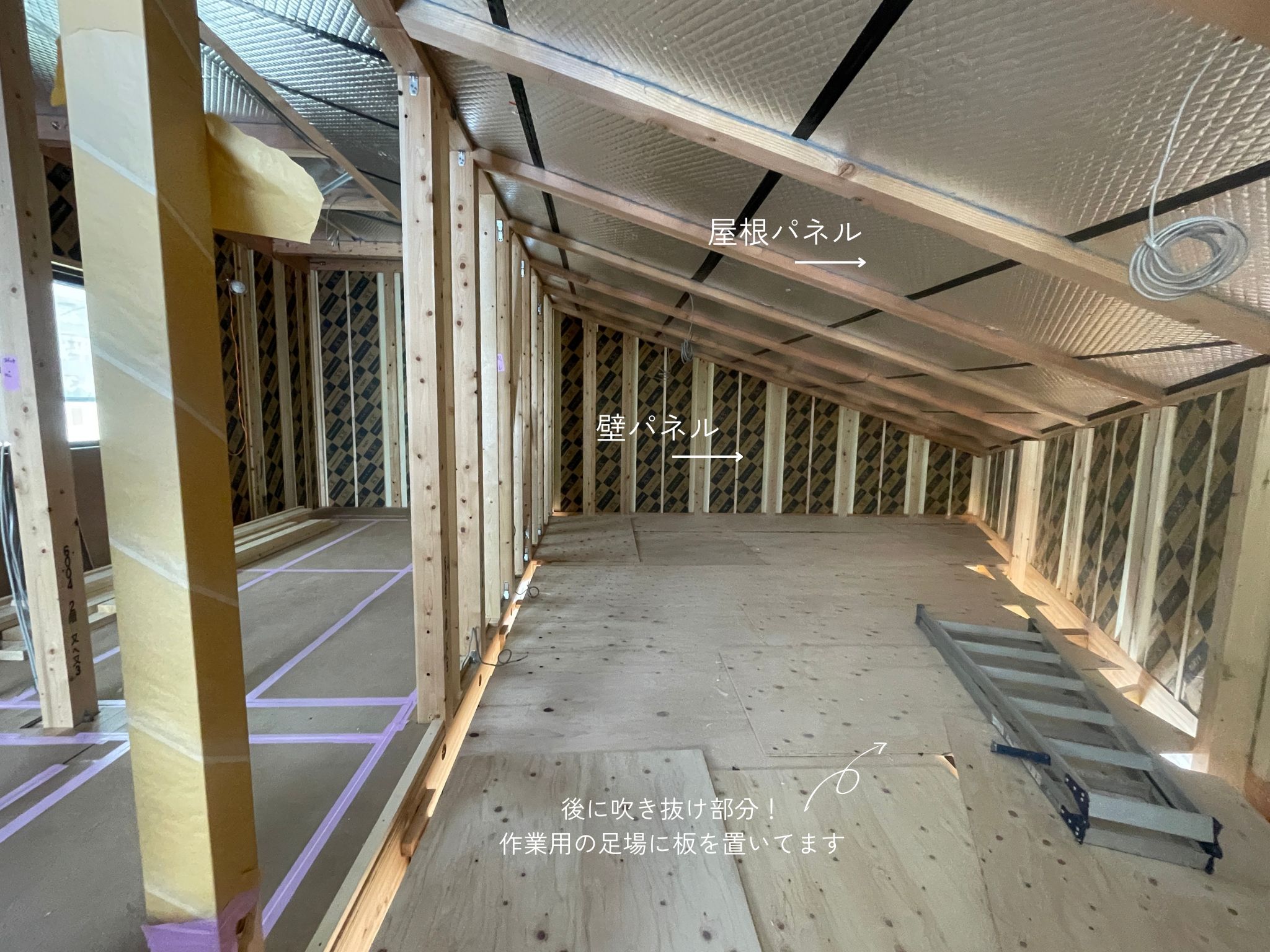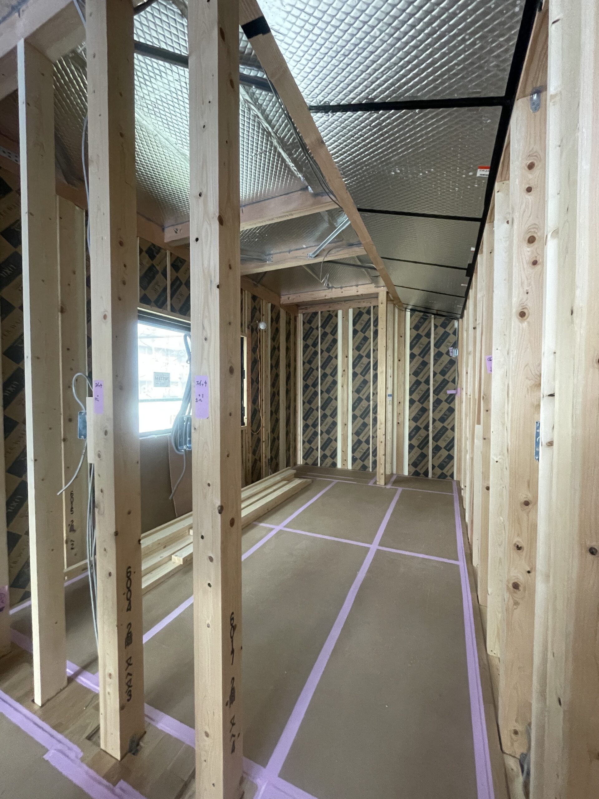 新築現場では、床、壁、天井の断熱施工が完了しました。