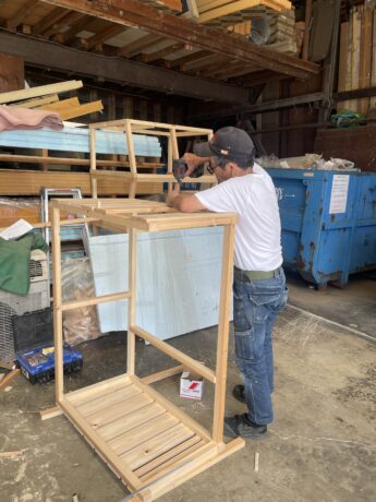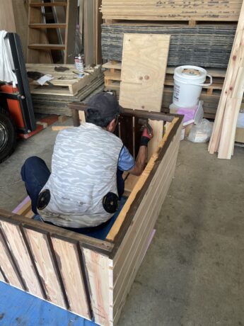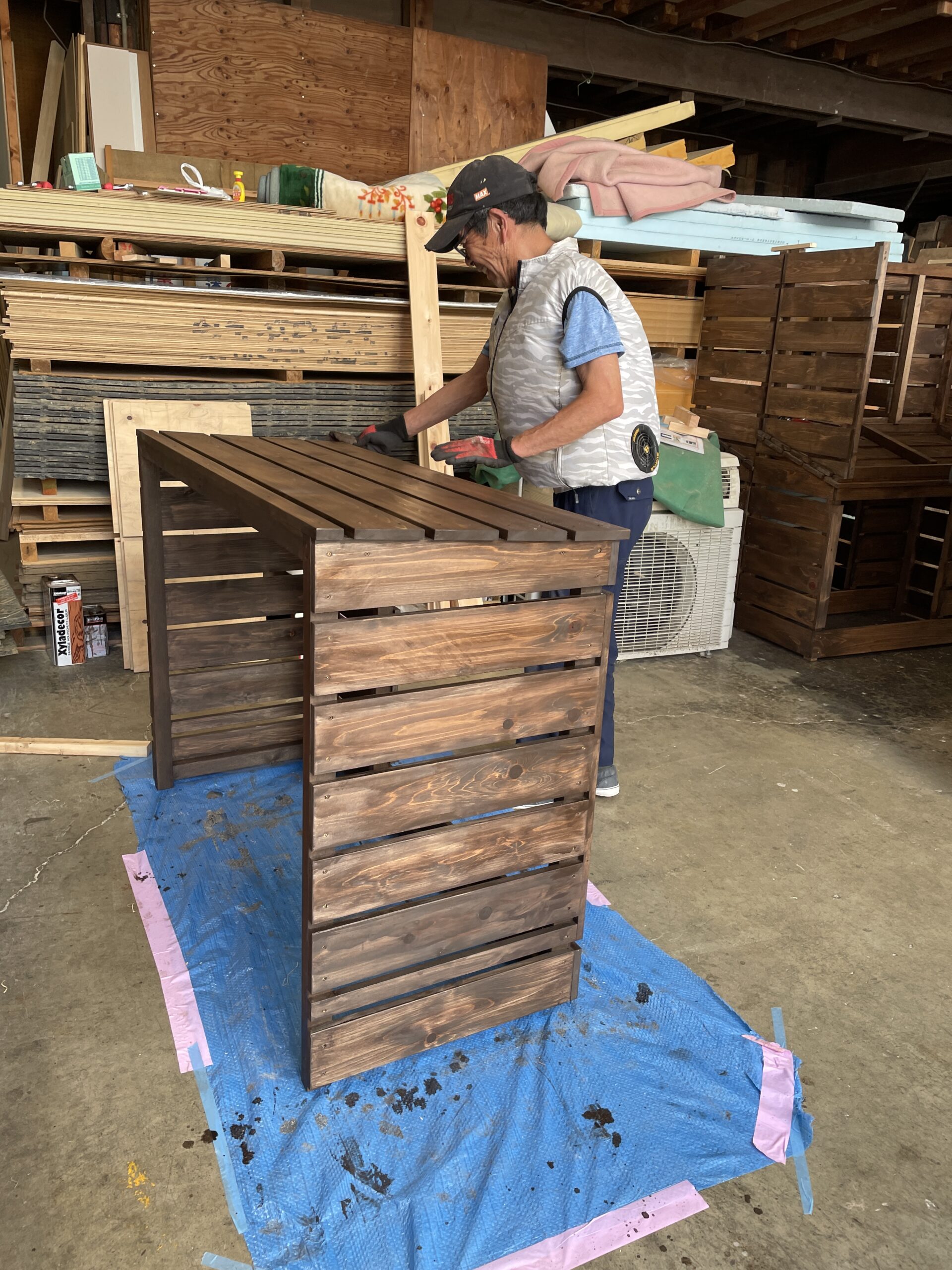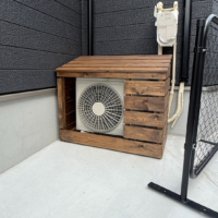 作業場で大工さんがエアコンの室外機のカバーを造作していました。