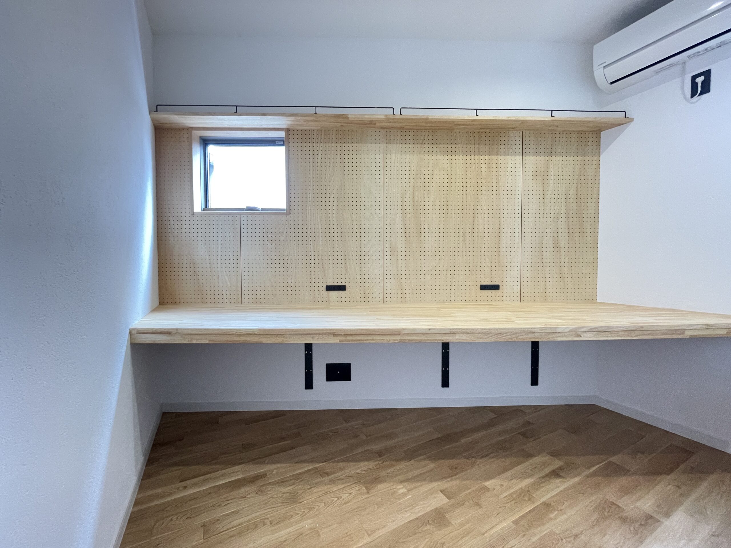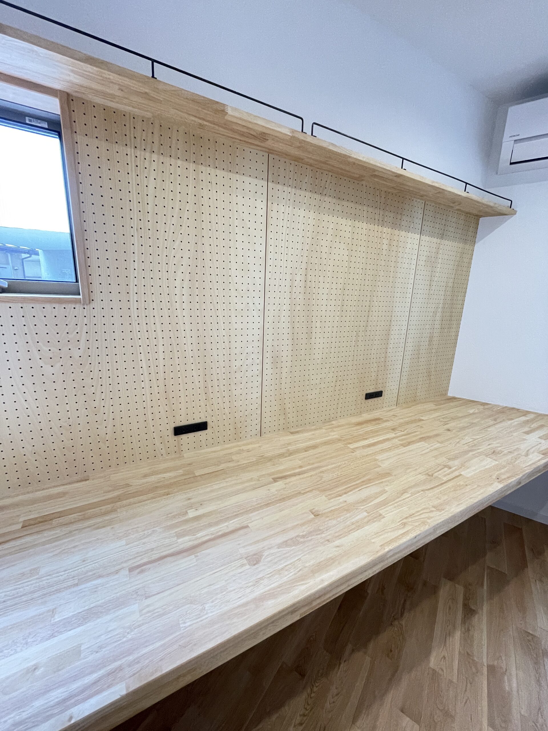 造作カウンターの前面にはシナ有孔ボードを使用。