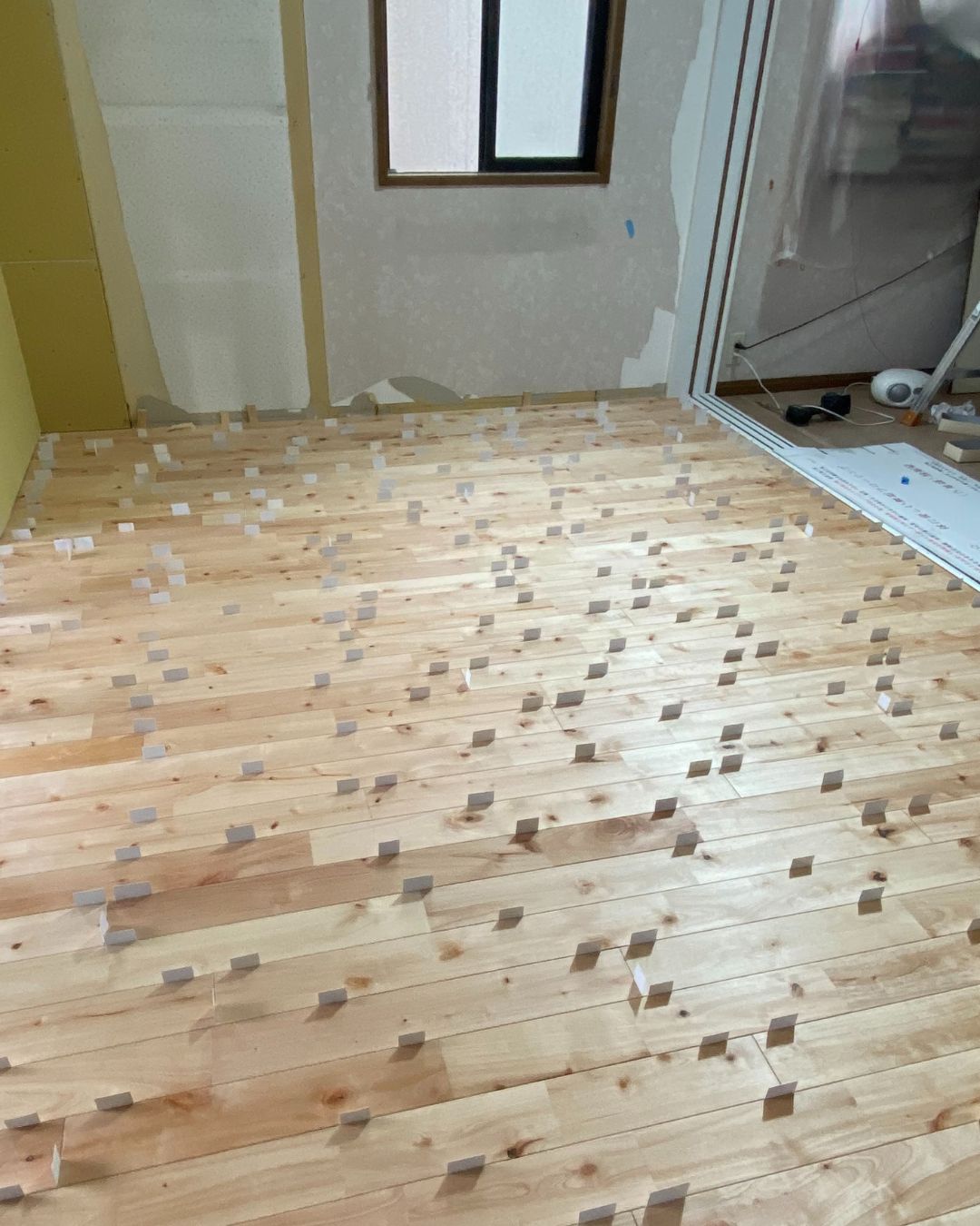 床材と床材の間に紙を挟みながら施工します。
