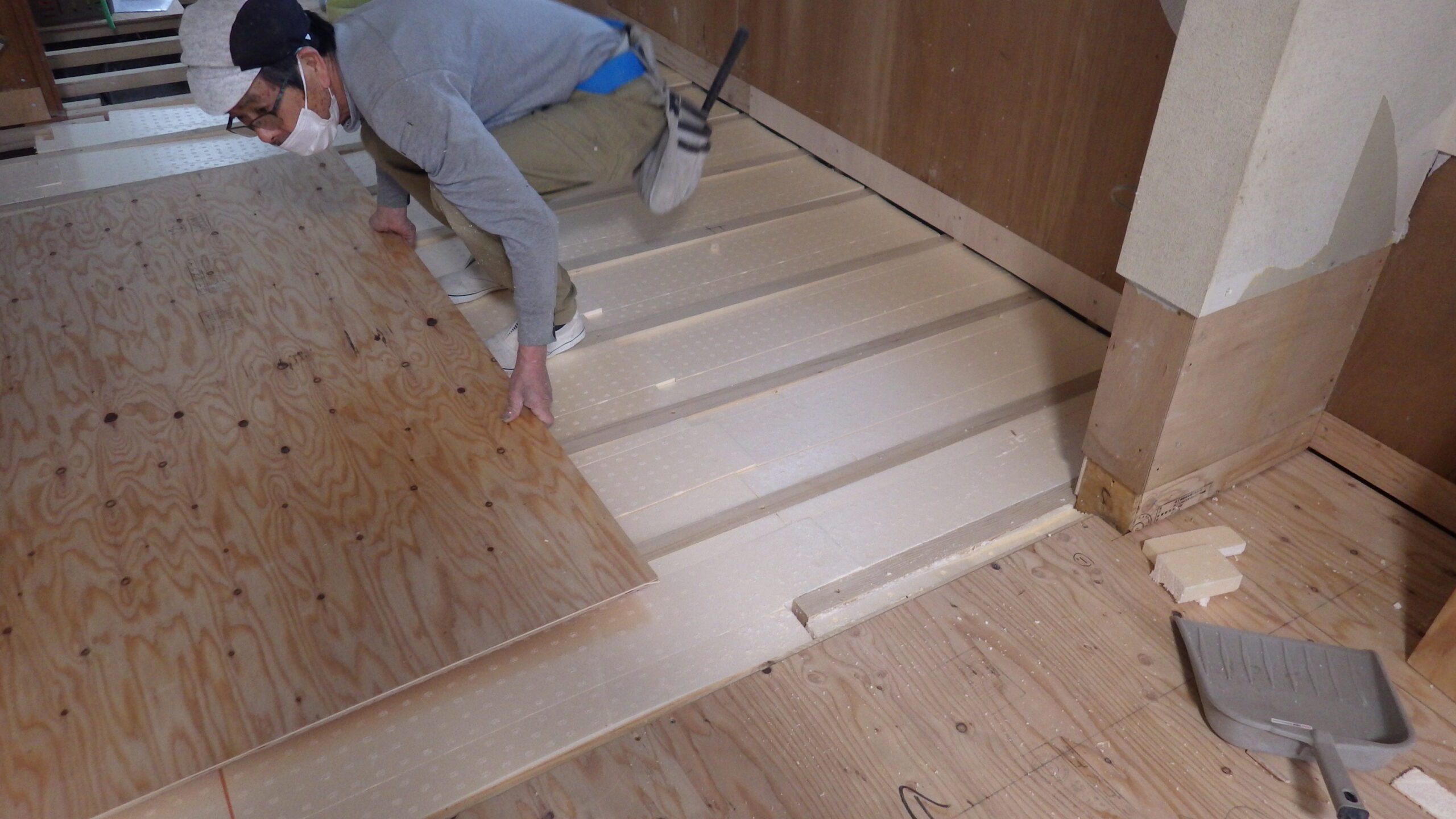 ③下地材の上に捨床材(構造用合板)を貼り、床の強度を上げます。