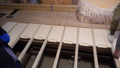 ①その後、大引材・根太材で床板の支えとなる床組みをします。